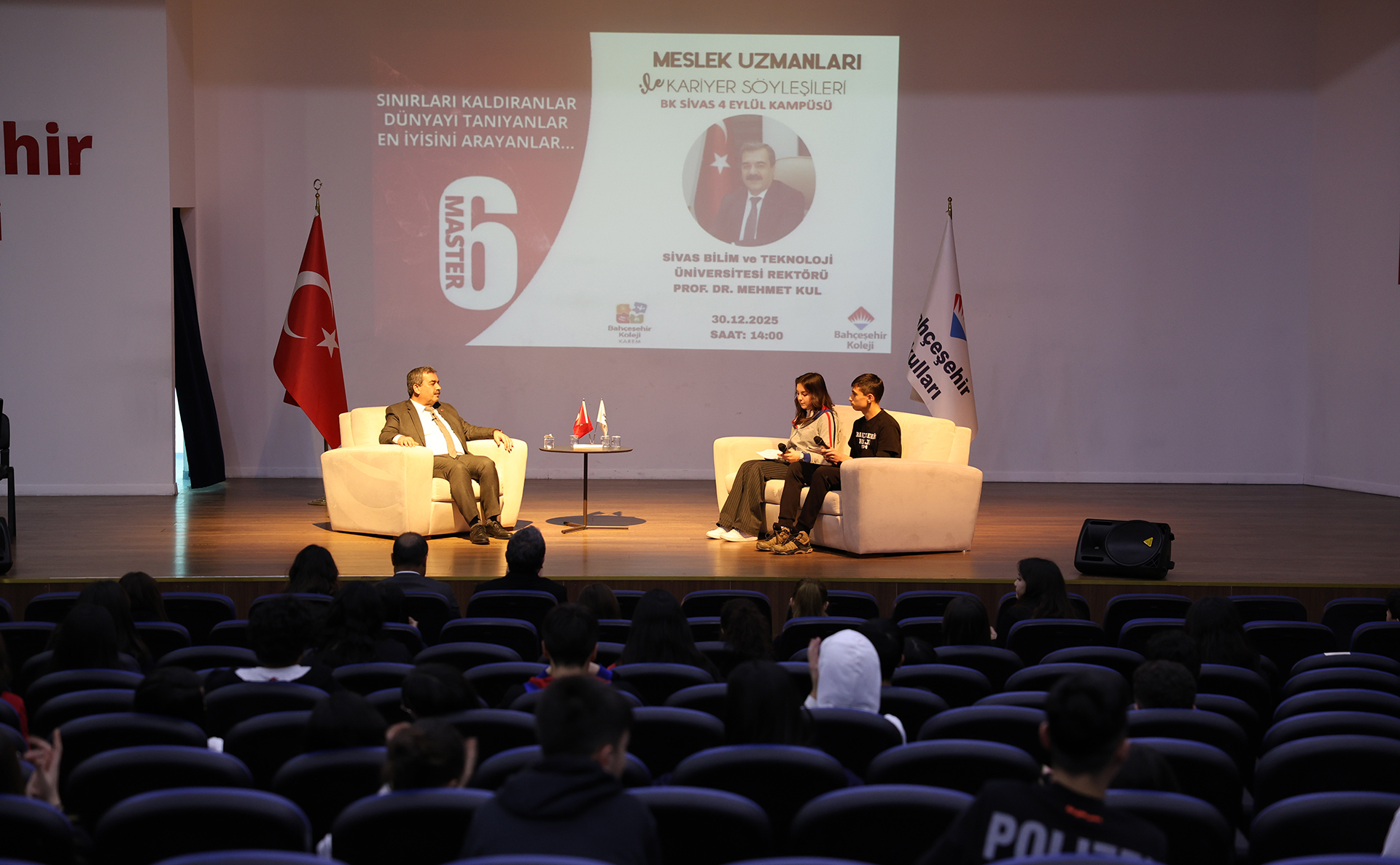 Sivas Bilim ve Teknoloji Üniversitesi (SBTÜ) Rektörü Prof. Dr. Mehmet Kul, Sivas Bahçeşehir Koleji tarafından düzenlenen Master6 Programı Kariyer Söyleşileri kapsamında öğrencilerle bir araya geldi. Programda öğrencilerle samimi bir atmosferde buluşan Prof. Dr. Kul, kariyer planlaması, hedef belirleme ve mesleki gelişim üzerine önemli tavsiyeler verdi.
