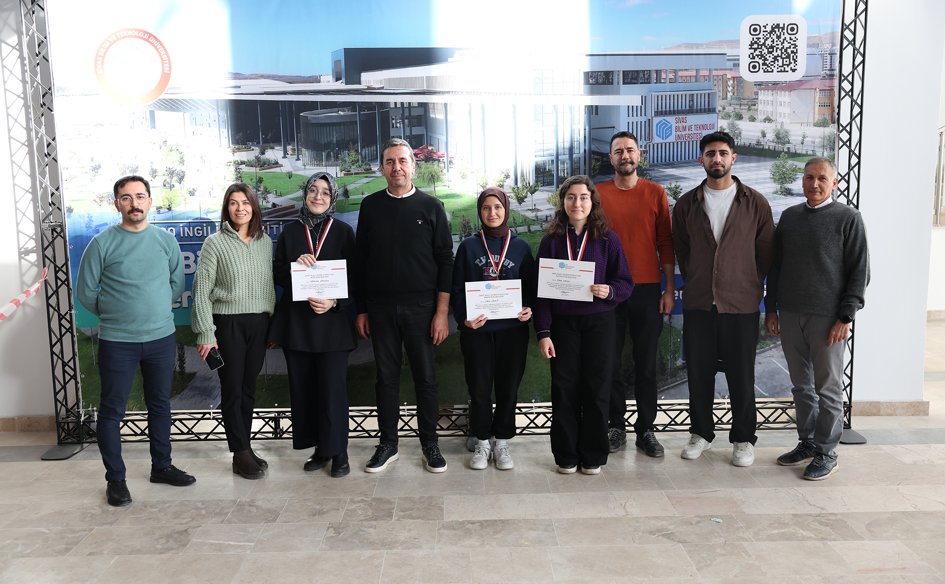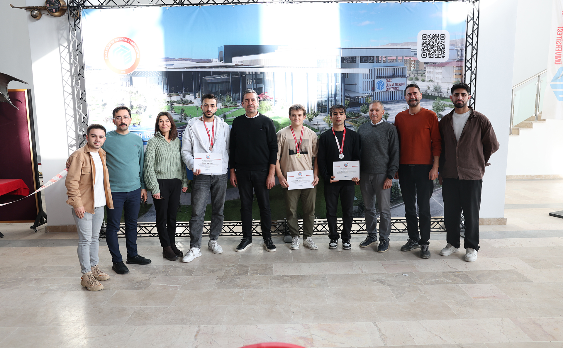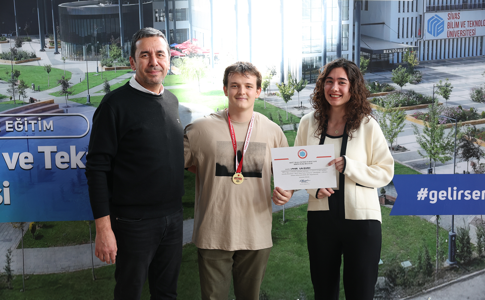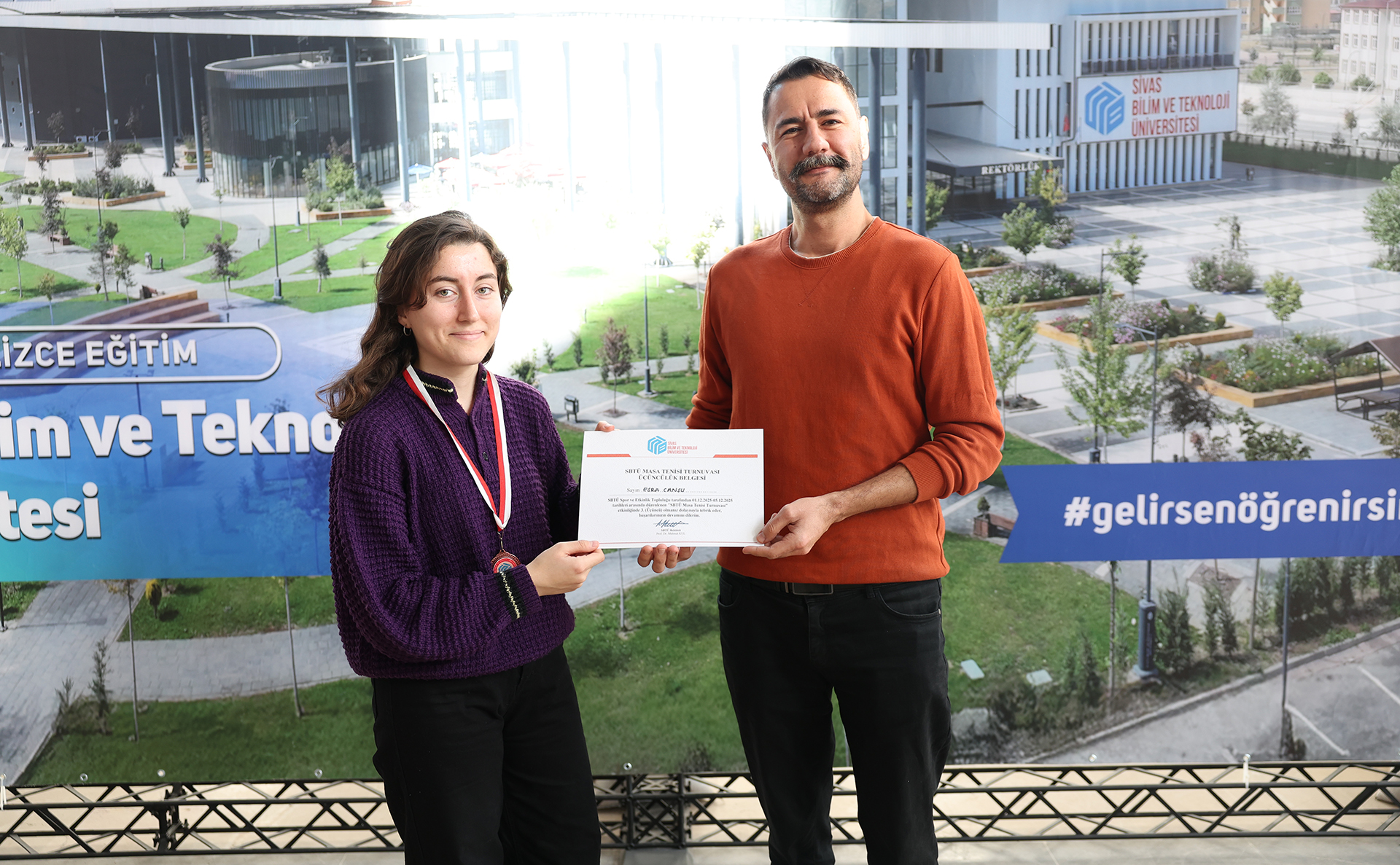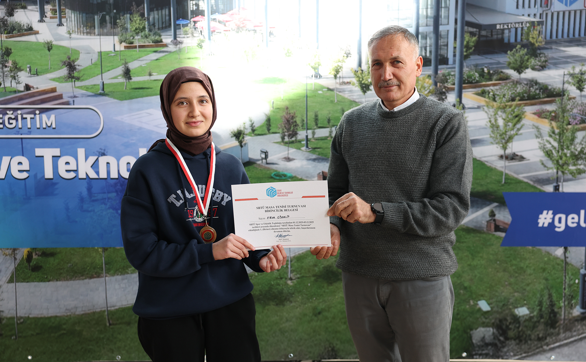Dereceye giren sporculara madalyalarını ve tebrik belgelerini Sağlık, Kültür ve Spor Daire Başkanı Çetin Özdemir, Öğrenci İşleri Daire Başkanı İsmail Kaya, Kültür ve Spor Şube Müdürü Hülya Bozbıyık, Kurumsal İletişim Koordinatörü Öğr. Gör. Ersin Polat takdim etti.