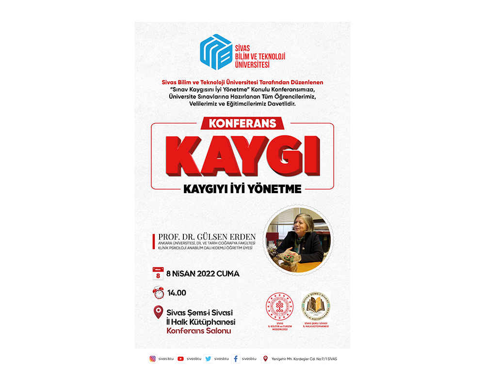 Sivas Bilim ve Teknoloji Üniversitesi, üniversite sınavlarına hazırlanan öğrencilere yönelik, “Sınav Kaygısını İyi Yönetme” konulu konferans düzenleyecek. Ankara Üniversitesi Öğretim Üyesi Prof. Dr. Hatice Gülsen Erden’in konuşmacı olarak katılacağı Konferans, 8 Nisan 2022 Cuma günü saat 14.00’te Şems-i Sivasi İl Halk Kütüphanesi Konferans Salonunda gerçekleştirilecek.