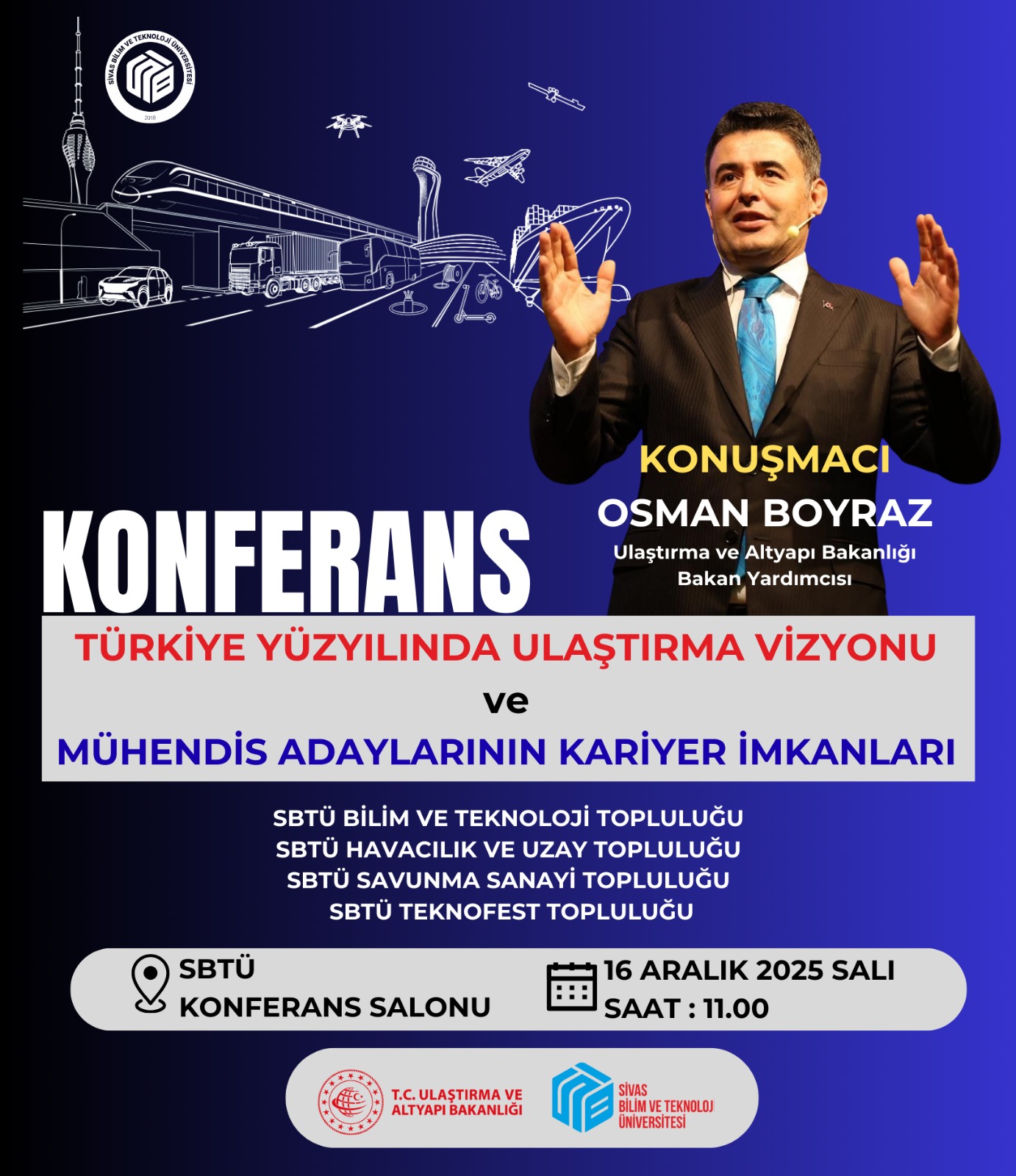 Sivas Bilim ve Teknoloji Üniversitesi, Ulaştırma ve Altyapı Bakan Yardımcısı Osman Boyraz’ın katılımıyla gerçekleştirilecek “Türkiye Yüzyılında Ulaştırma Vizyonu ve Mühendis Adaylarının Kariyer İmkânları” konulu önemli bir konferansa ev sahipliği yapacak.